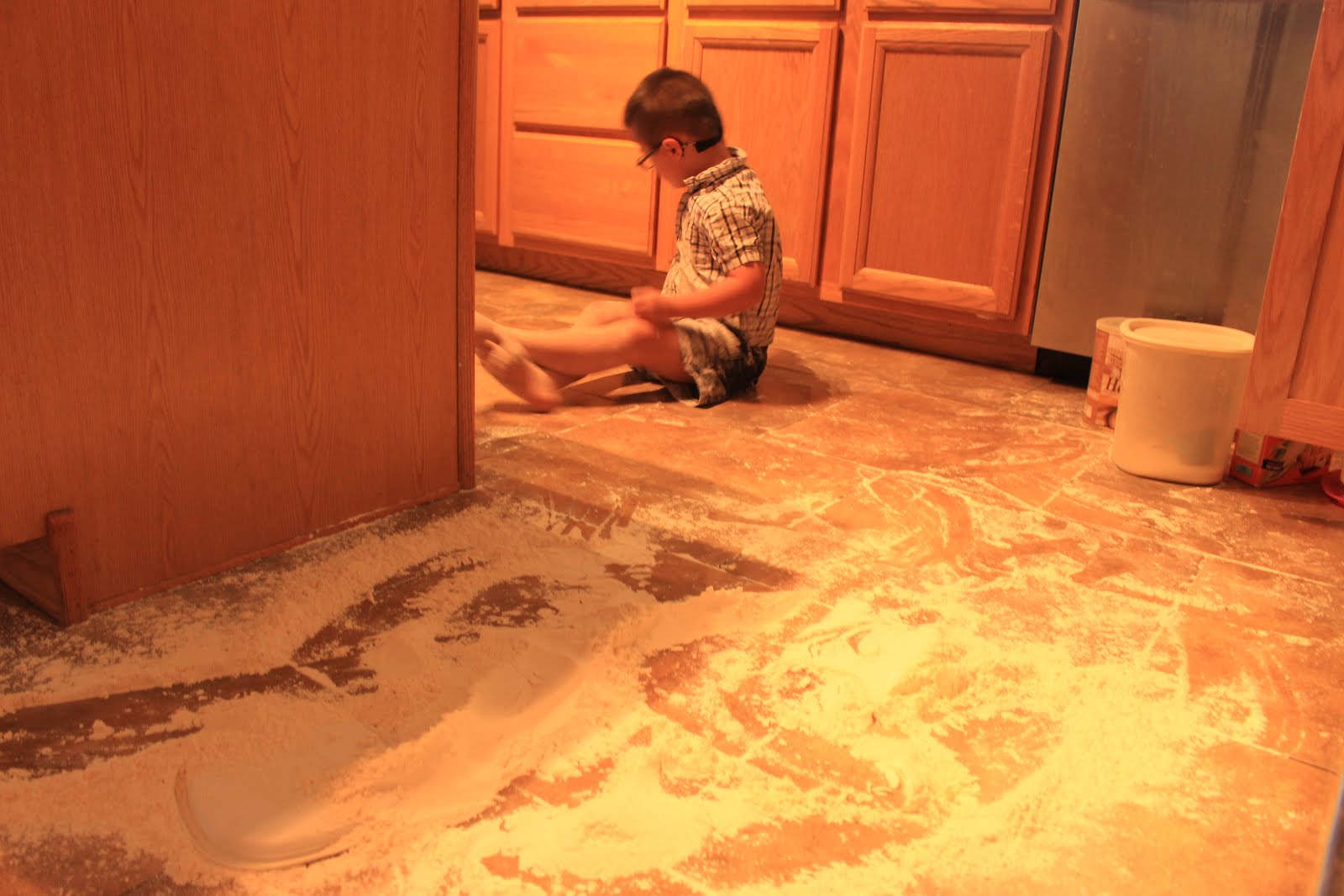 Bubby tried baking on his own one day while I was upstairs folding laundry. Apparently the baby locks on the cabinets aren't Bubby proof any more!! We shall chalk this one up to sensory play!! Another monkey see, monkey do - buttering bread. I suppose buttering an entire loaf is more efficient!